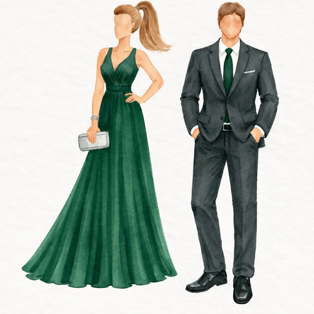 - Para las mujeres, vestidos largos o midi, preferiblemente con tacón ancho, ya que la ceremonia se celebrará sobre el césped.